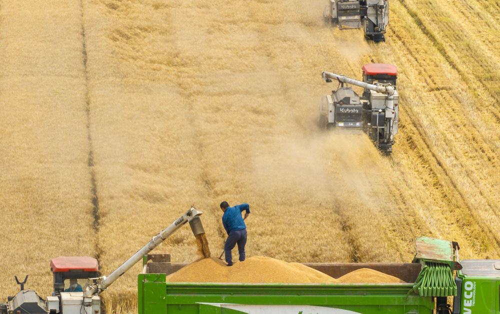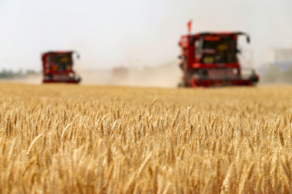 5月28日,在安徽省淮北市濉溪县五沟镇庙前村,农机手驾驶收割机收割小麦。新华社发(万善朝 摄)