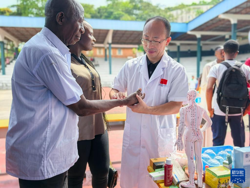 10月22日,在塞拉利昂首都弗里敦,第26批中国援塞拉利昂医疗队成员在活动中为当地居民进行中医诊疗。新华社发(第26批中国援塞拉利昂医疗队供图)