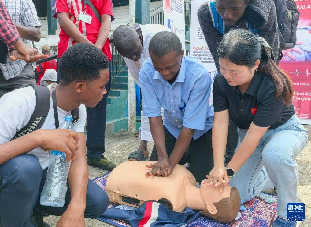 10月22日,在塞拉利昂首都弗里敦,第26批中国援塞拉利昂医疗队成员在活动中为当地居民进行心肺复苏教学。新华社发(第26批中国援塞拉利昂医疗队供图)