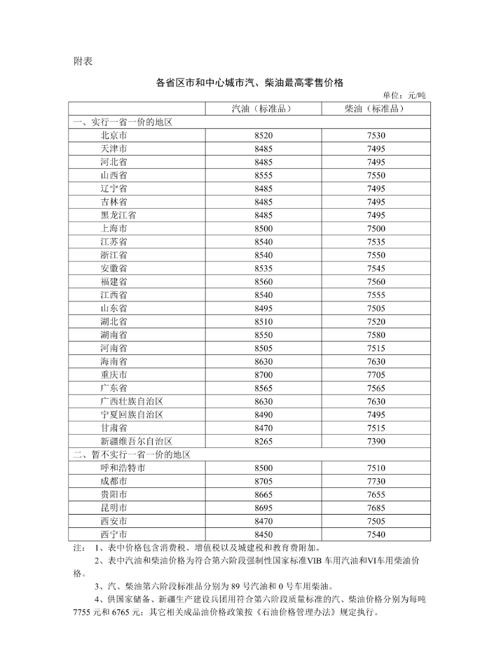 附:各省区市和中心城市汽、柴油最高零售价格