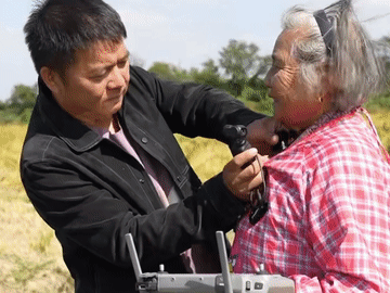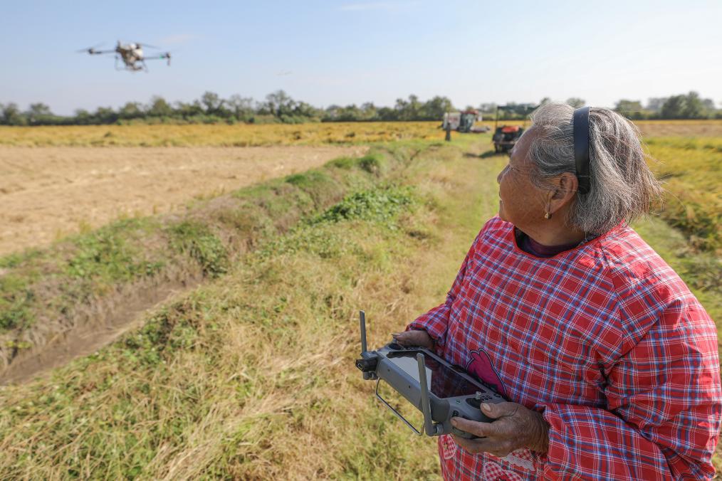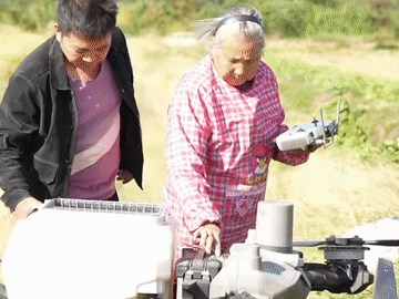 戴淑英(右)在王甜甜的指导下操作植保无人机。