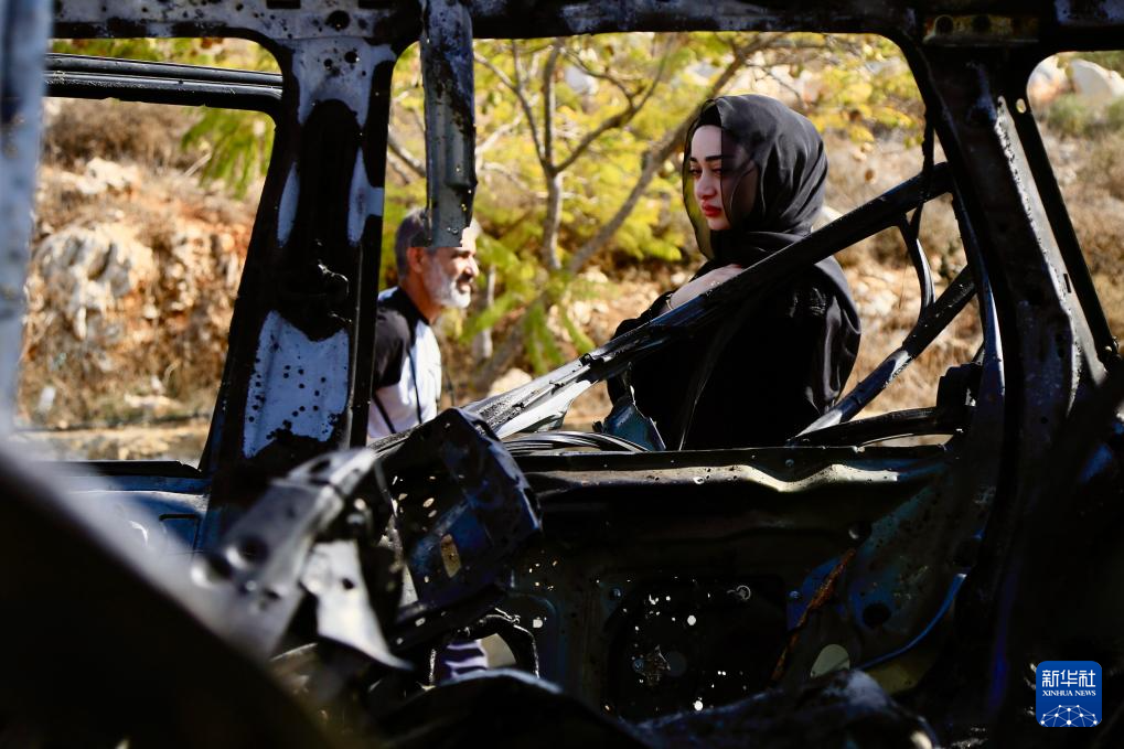 11月2日,在黎巴嫩南部一村庄,一名女子看着遭袭汽车残骸。新华社发(阿里·哈希绍摄)