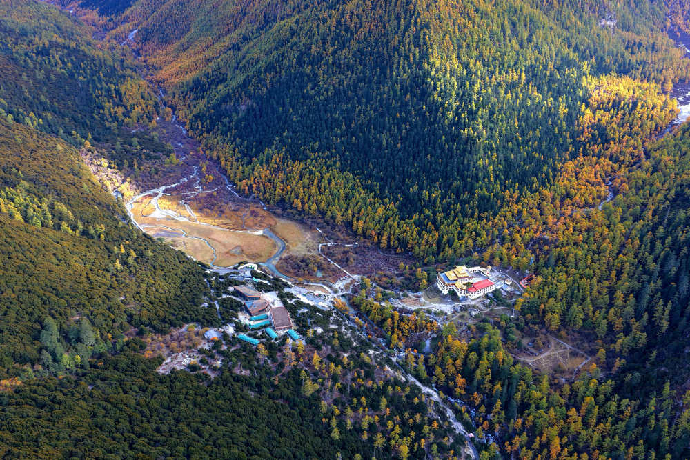 ↑ 俯瞰雪山下的亚丁村(10月30日摄)。新华社发(庄歌尔摄)