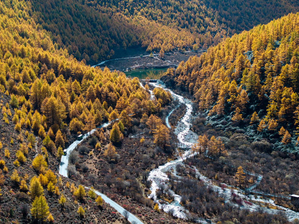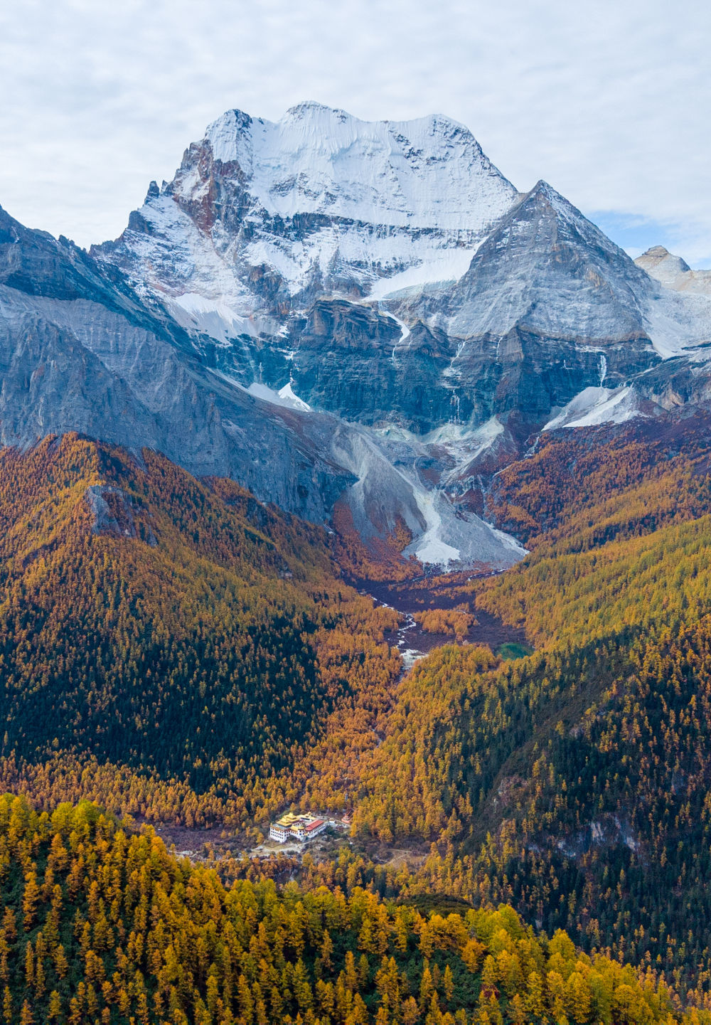 ↑ 稻城亚丁景区层林尽染(10月28日摄,无人机照片)。新华社记者 江宏景 摄