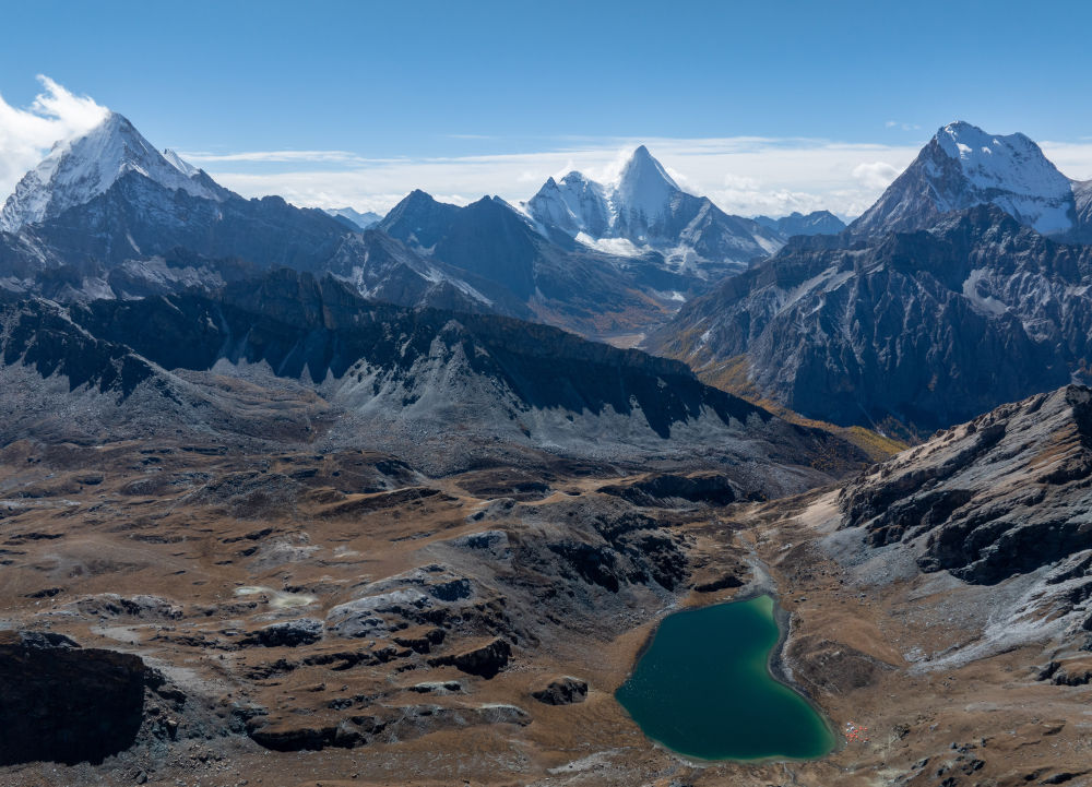↑ 夏诺多吉雪山下的角峰冰川地貌(10月28日摄,无人机照片)。新华社记者 江宏景 摄
