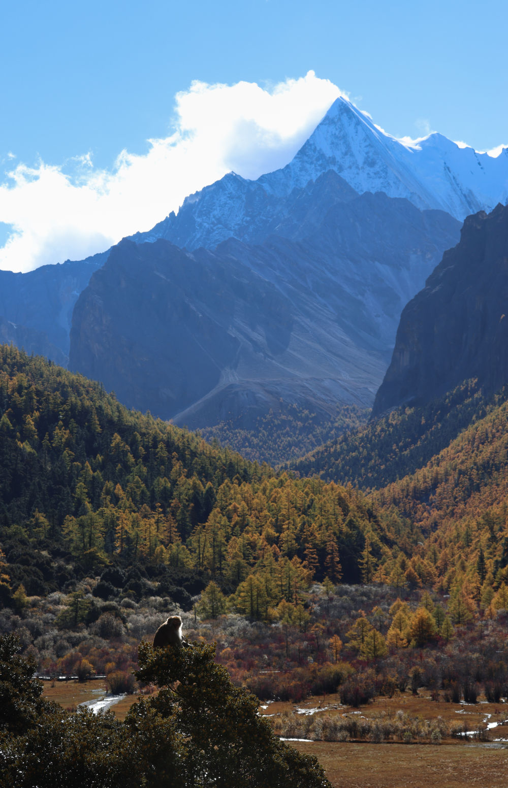 ↑ 在稻城亚丁景区,蓝天、白云、雪山与彩林相互映衬(10月28日摄)。新华社记者 江宏景 摄