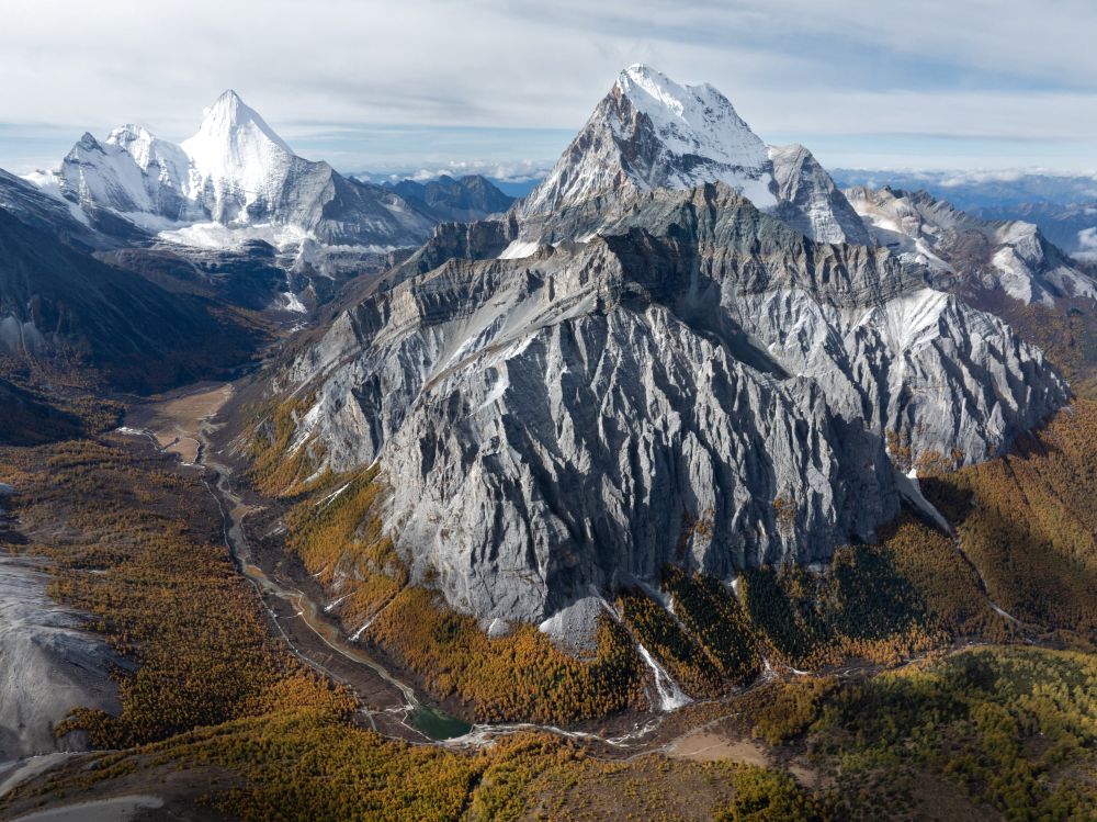 ↑ 俯瞰仙乃日雪山和彩林(10月30日摄,无人机照片)。新华社发(翁光建摄)