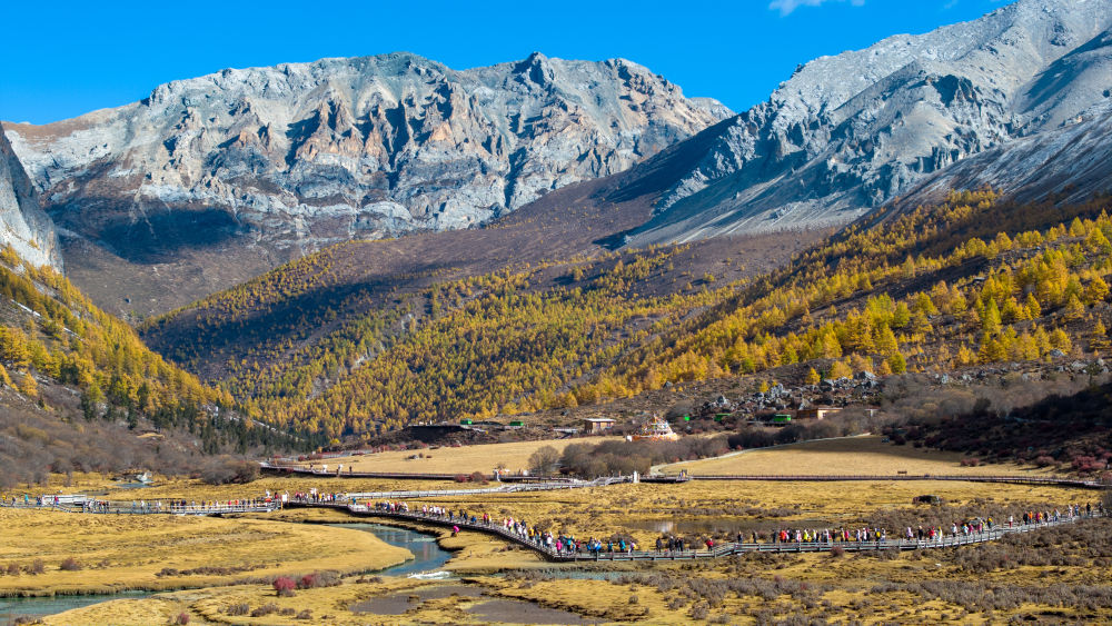 ↑ 游人走在稻城亚丁景区洛绒牛场步行栈道上(10月29日摄,无人机照片)。新华社发(翁光建摄)