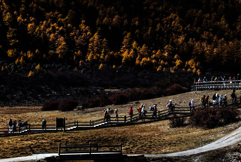 ↑ 在稻城亚丁景区,游人沿着步行栈道游览(10月29日摄)。新华社发(兰红光摄)