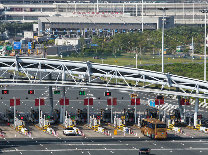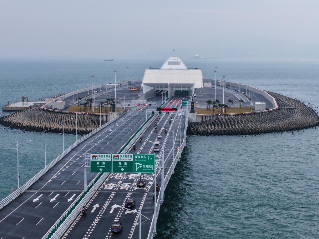 2025年10月19日,车辆经港珠澳大桥驶向珠海公路口岸(无人机照片)。新华社记者 邓华 摄