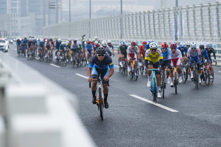 2024年11月24日,2024粤港澳公路自行车赛暨第十五届全国运动会公路自行车测试赛举行,图为参赛选手在澳门大桥骑行。新华社发(张金加摄)