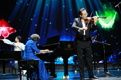 88岁的中国第一代老钢琴演奏家巫漪丽和国际知名小提琴演奏家薛苏里共同带来钢琴小提琴二重奏《梁祝》。黄瑞鹏摄