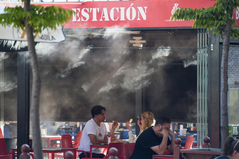 2025年9月17日,在西班牙马德里,顾客在水雾装置附近用餐。新华社发(古斯塔沃·巴连特摄)