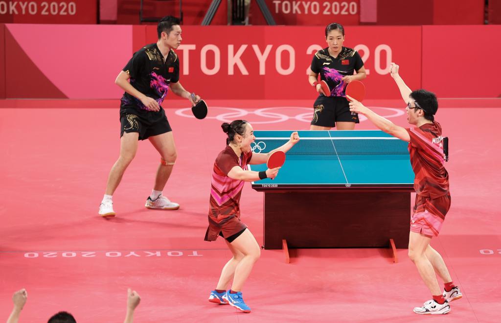 2021年7月26日,在东京奥运会乒乓球混双决赛中,中国队选手许昕/刘诗雯不敌日本队选手水谷隼/伊藤美诚,获得亚军。新华社记者 郑焕松 摄