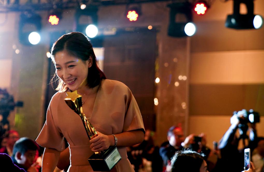 2019年12月11日,中国运动员刘诗雯在颁奖盛典上。刘诗雯获国际乒联2019年度最佳女运动员称号。新华社记者 李安 摄