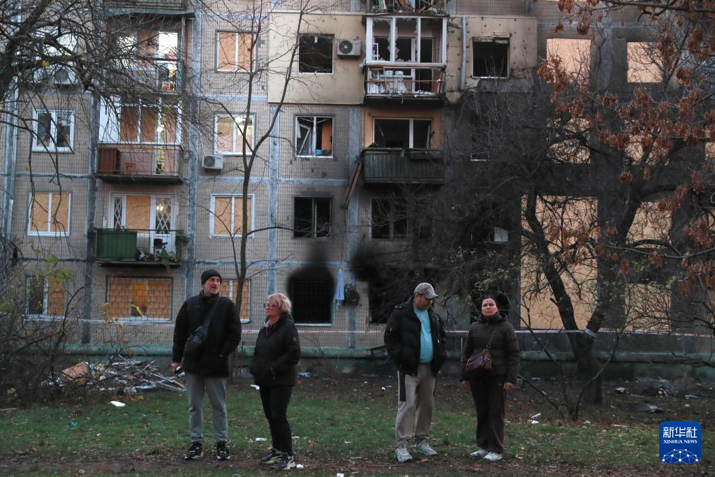 11月14日,在乌克兰首都基辅市第聂伯区,当地居民站在遭受空袭损毁的房屋前。新华社记者 李东旭 摄
