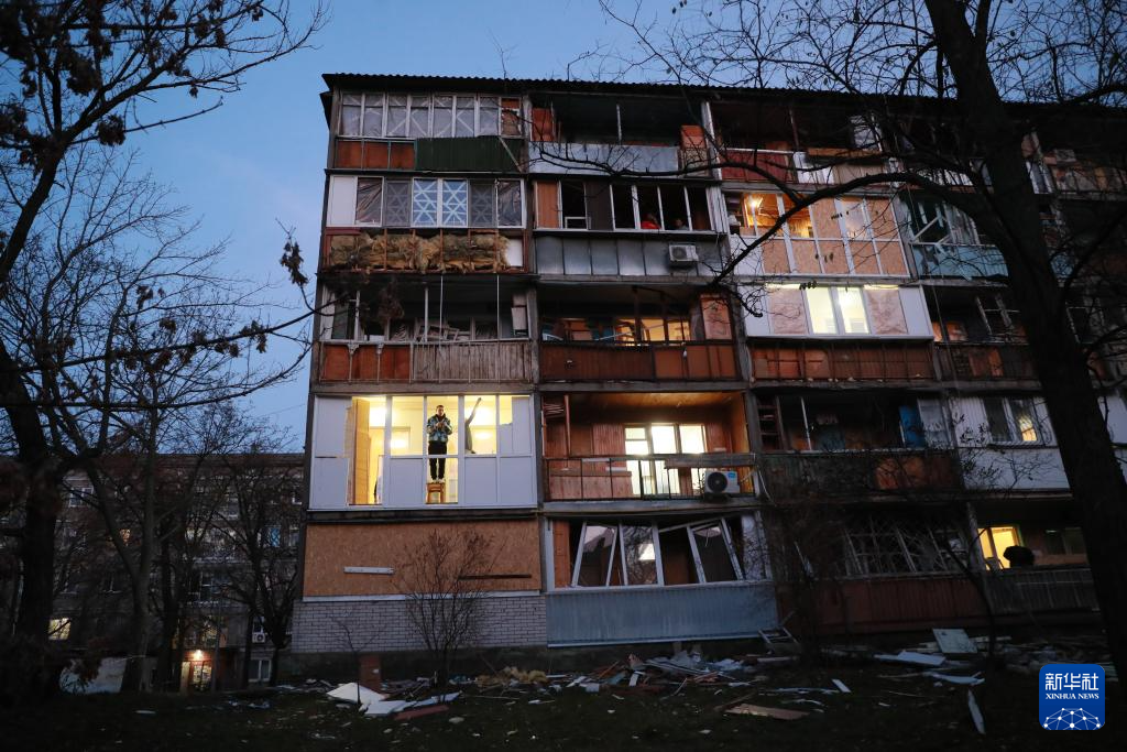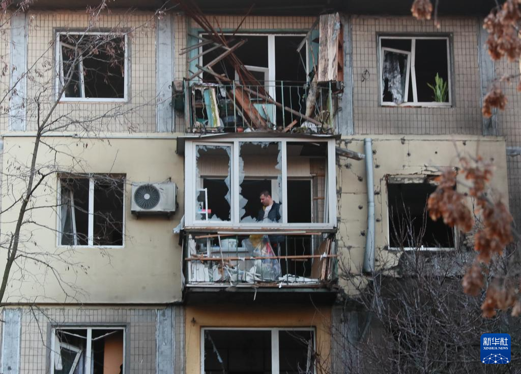 11月14日,在乌克兰首都基辅市第聂伯区,当地居民对遭受空袭损毁的房屋进行清理。新华社记者 李东旭 摄