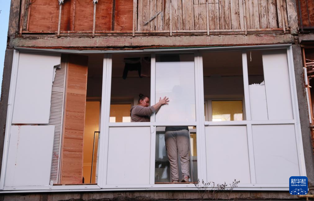 11月14日,在乌克兰首都基辅市第聂伯区,当地居民对遭受空袭损毁的房屋进行修缮加固。新华社记者 李东旭 摄