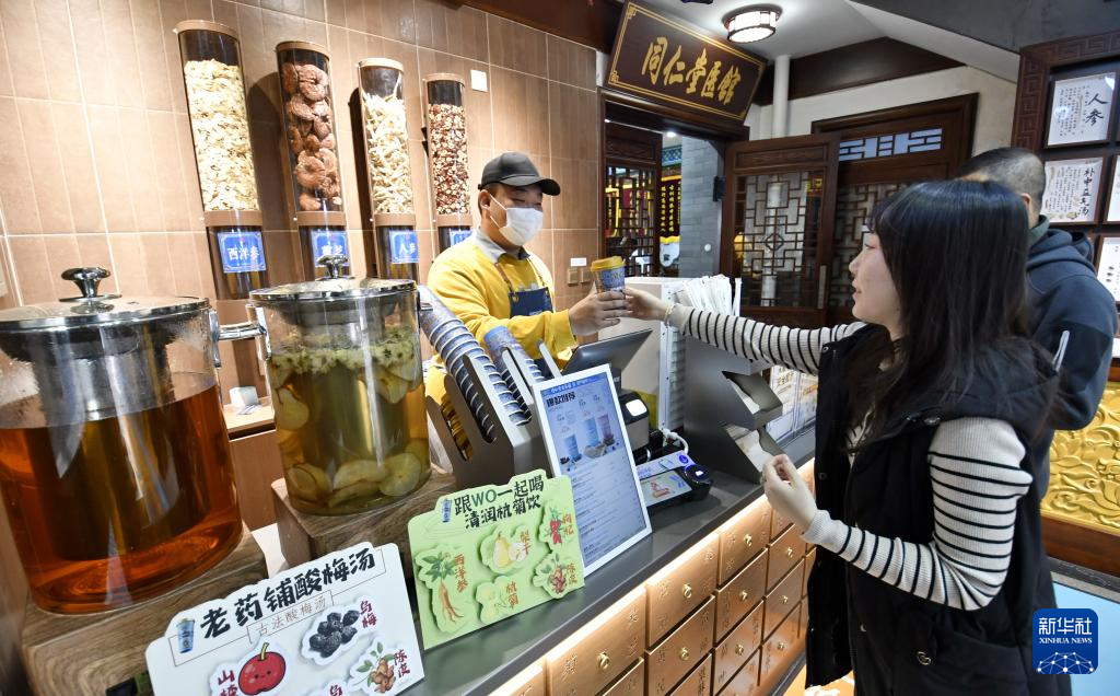 11月13日,游人在同仁堂中医馆的药茶品尝区体验药茶饮品。