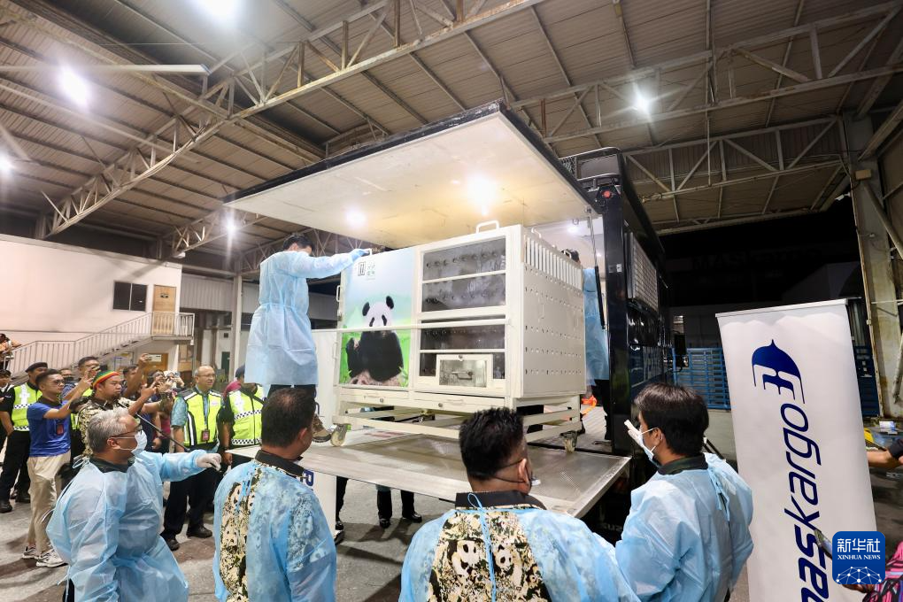 11月18日,工作人员在马来西亚吉隆坡国际机场转运大熊猫。新华社发(马来西亚天然资源及环境永续部供图)