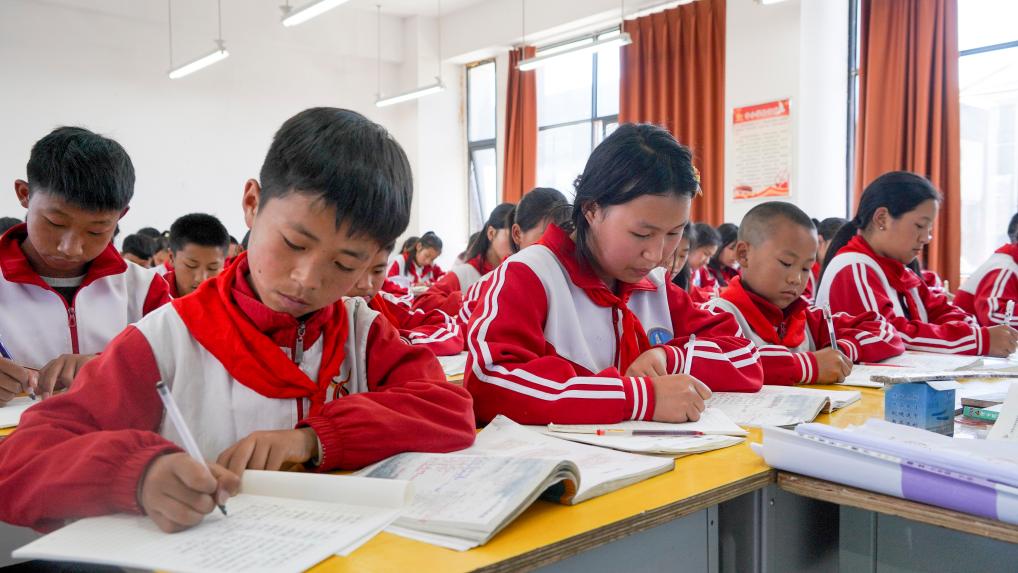 4月21日,四川省凉山州昭觉县城北镇沐恩邸中心小学学生在课堂上写作业。(新华社记者尹恒摄)
