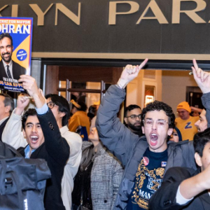 11月4日,支持者在美国纽约庆祝马姆达尼当选市长。新华社发(章正浩摄)