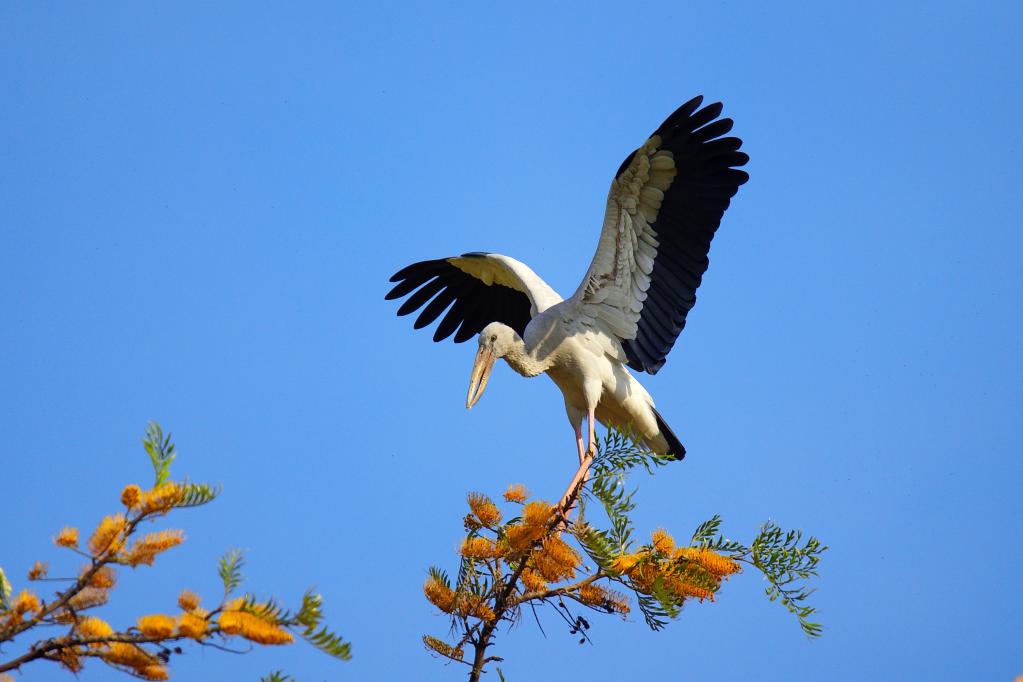 2025年11月,观鸟爱好者在邛海国家湿地公园拍摄到的钳嘴鹳。(西昌市摄影家协会供图)