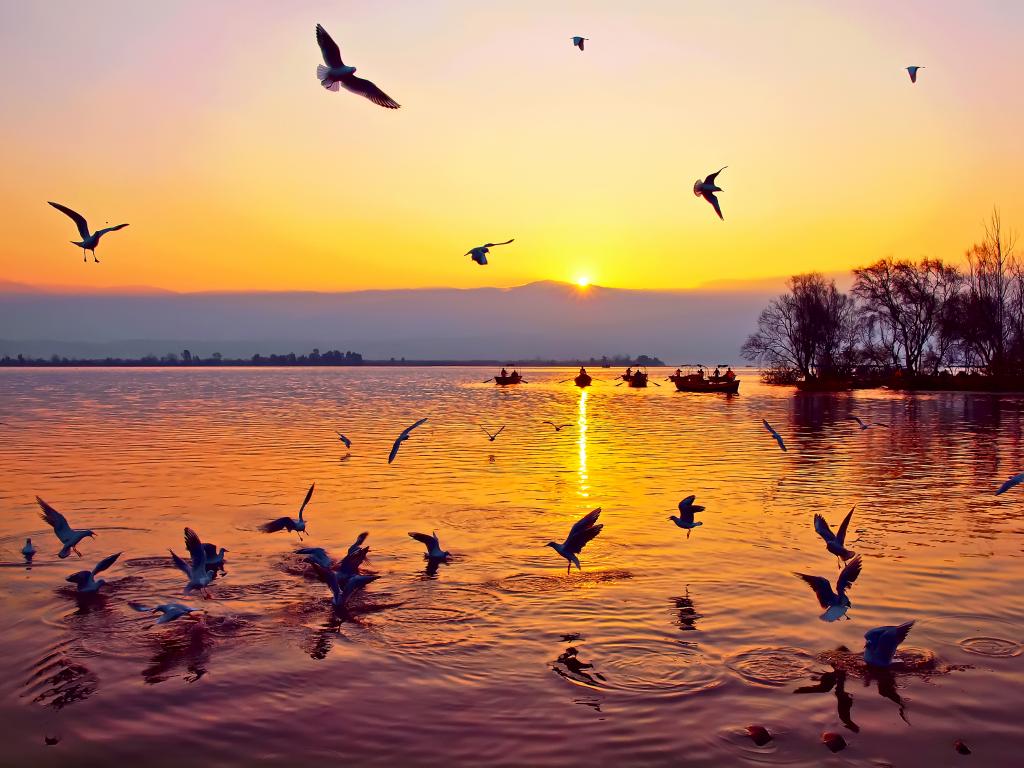 2025年11月,邛海国家湿地公园内群鸟翩飞。(西昌市摄影家协会供图)