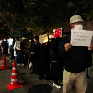 11月28日,民众在日本东京的首相官邸外参加抗议活动。新华社记者 贾浩成 摄