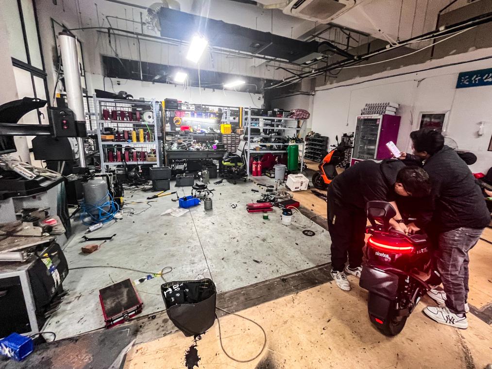 11月26日,在上海市郊一家电动自行车改装店铺,工作人员对电动自行车进行改装。改装后的车辆时速可轻松破百。