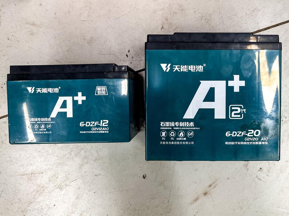 11月14日在上海市郊一家电动自行车销售店铺拍摄的电池。工作人员表示可使用左侧电池帮助解决上牌问题,而顾客实际使用的是右侧容量更大的电池。