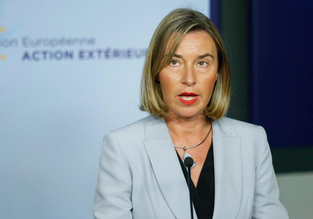 2018年1月11日,在比利时布鲁塞尔,时任欧盟外交和安全政策高级代表莫盖里尼在新闻发布会上讲话。新华社记者叶平凡摄