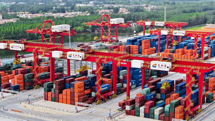 2024年8月3日,济宁港航龙拱港集装码头,货船停泊装运集装箱。新华社记者 郭绪雷 摄