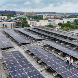 9月17日,在四川都江堰经济开发区,朱鹏宇(左)和同事检查工业用户新装屋顶光伏板情况(无人机照片)。新华社记者 王曦 摄