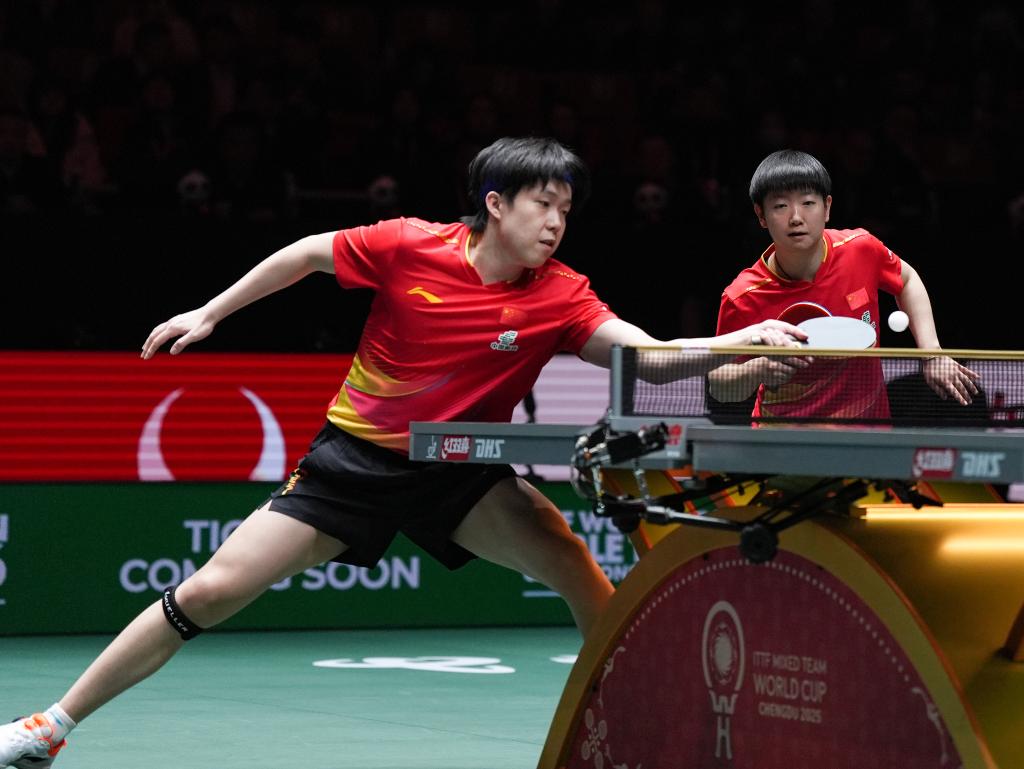 12月6日,孙颖莎/王楚钦(左)在比赛中。新华社记者 王曦 摄