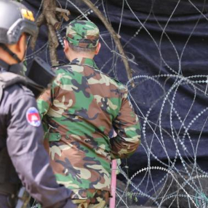 8月14日,在柬埔寨班迭棉吉省一个边境村庄,柬埔寨武装人员在铁丝网和轮胎旁执勤。新华社/柬新社