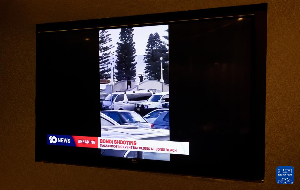 这是12月14日在澳大利亚悉尼拍摄的报道邦迪滩枪击事件的电视画面。新华社记者 马平 摄