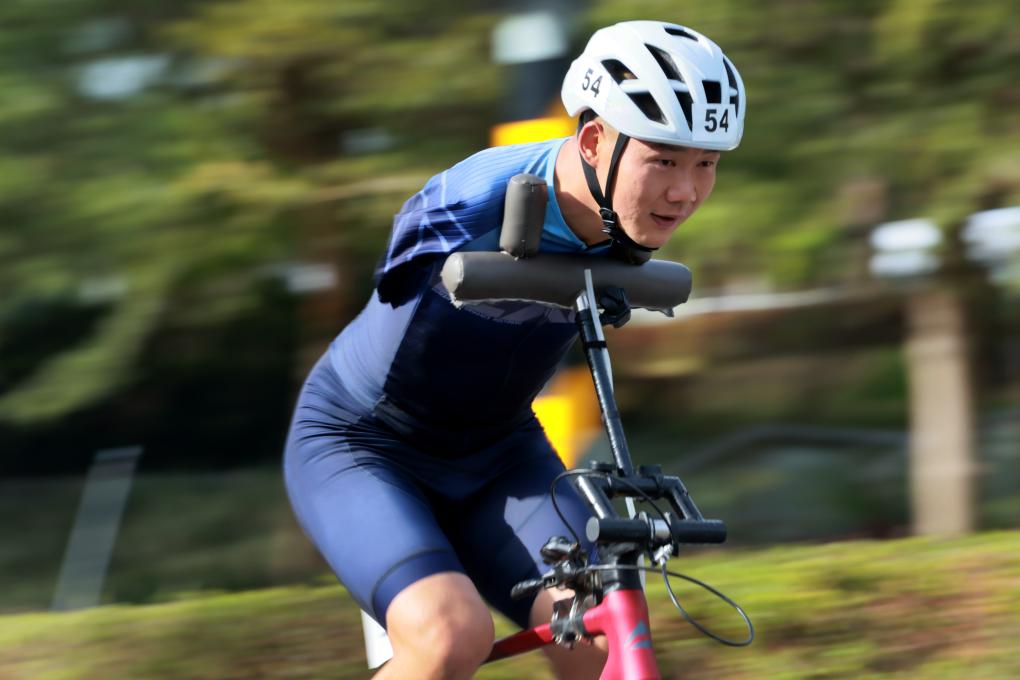 11月27日,残特奥会铁人三项比赛在广东肇庆开赛,新疆队选手邓伟在骑行。新华社发(刘春林摄)