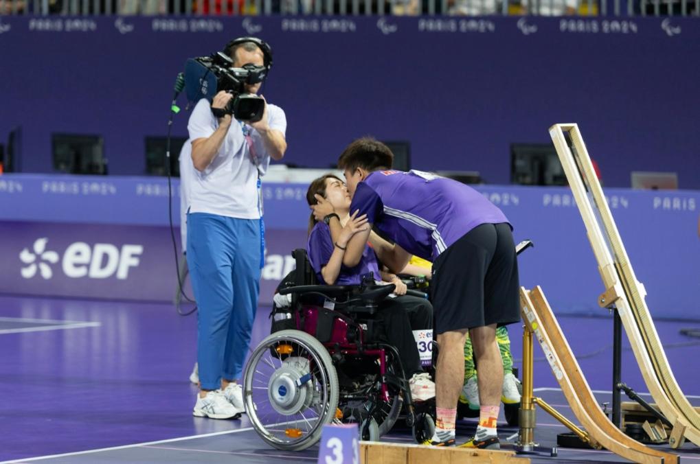 2024年的巴黎残奥会上,李荣杰向何宛淇送上情深一吻。