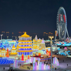 夜幕降临,120万平方米的园区渐次亮起。五彩斑斓的灯光透过晶莹的冰体,闪耀着梦幻般的光泽。高达120米的“雪花摩天轮”、以阳明滩大桥为造型的“梦想大舞台”、令人振奋的“大国重器”冰雕展区……他们流连许久。