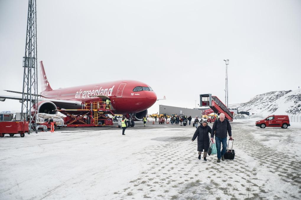 3月18日,在丹麦自治领地格陵兰岛首府努克,一对夫妇相互搀扶走出机场。新华社记者彭子洋摄