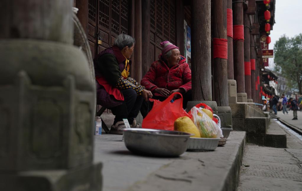拼版照片:上图为村民在昭化古城内制作核桃酥;左下图为在昭化古城的商铺里,一名小姑娘一边看摊儿一边写作业(2025年12月13日摄);右下图为村民坐在昭化古城内。