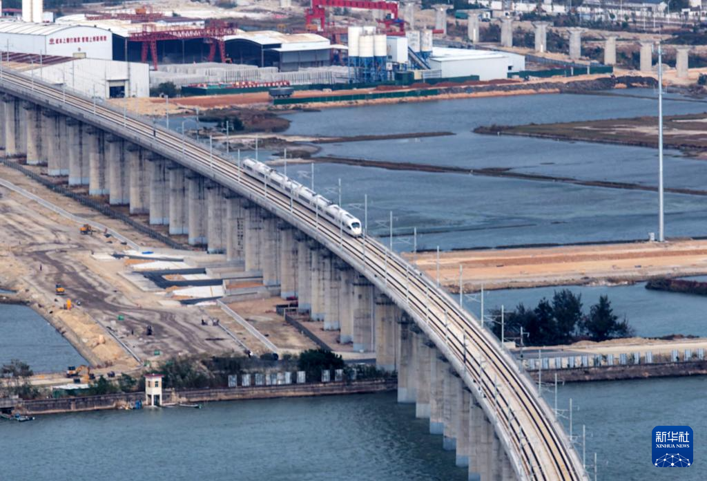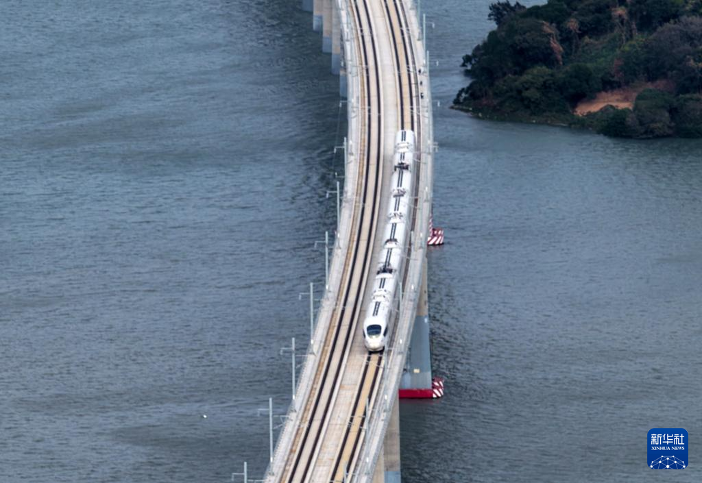 这是12月22日拍摄的行驶在汕头濠江特大桥上的高铁列车。新华社发(姚军 摄)
