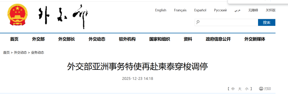 2025年12月18日至23日,中国外交部亚洲事务特使邓锡军访问柬埔寨和泰国,就近期两国边境冲突穿梭调停,在柬分别会见首相洪玛奈、副首相兼外交大臣布拉索昆、副首相兼国防大臣迪西哈和王家军陆军司令毛索潘,在泰会见总理阿努廷、国防部长纳塔蓬、泰军最高司令乌格力和外交部次长艾斯丽。