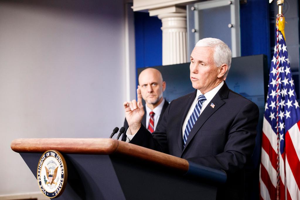 图为2020年3月6日,在美国华盛顿白宫,时任美国副总统彭斯(前)在新闻发布会上讲话。新华社发(沈霆摄)
