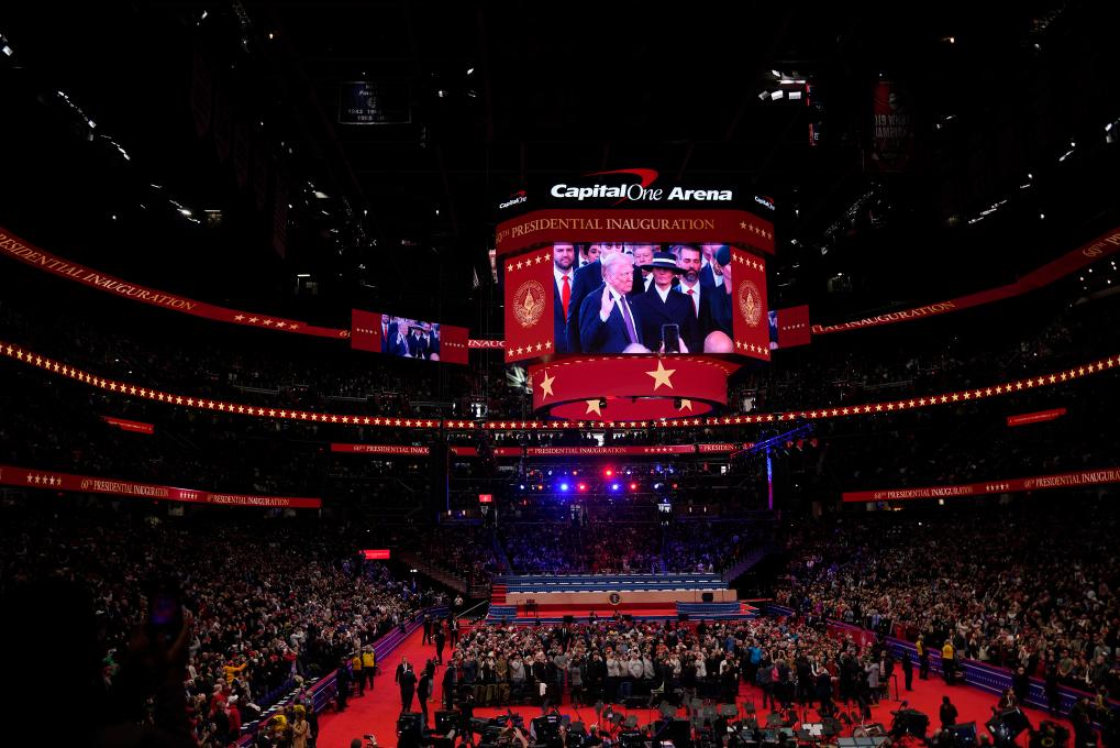 1月20日,在美国首都华盛顿第一资本体育馆,人们观看美国第47任总统就职典礼的转播。新华社记者吴晓凌摄