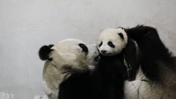 这是大熊猫曼兰和幼崽的互动影像动图。