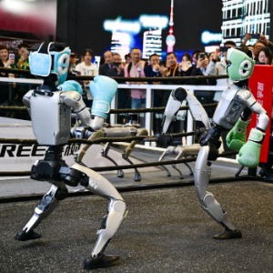 2025年11月6日,在第八届进博会宇树科技展台,人形机器人进行格斗表演。新华社记者 蔡湘鑫 摄