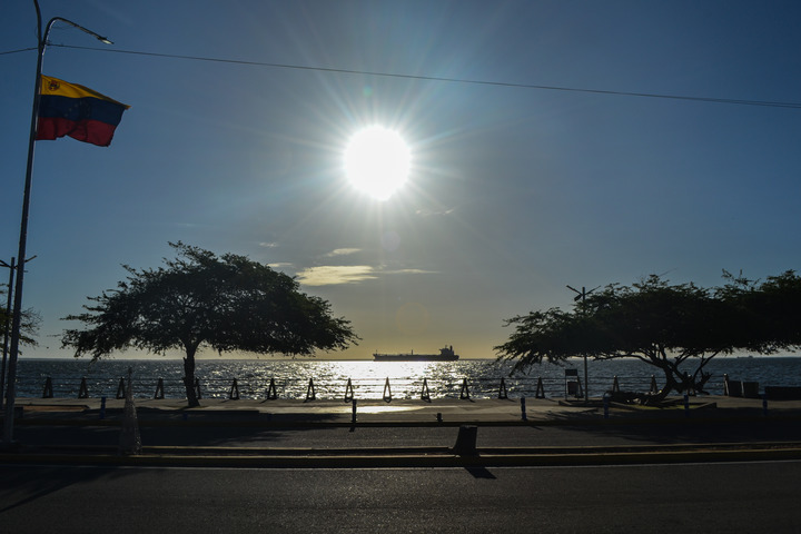2025年12月23日,一艘油轮停泊在委内瑞拉苏利亚州马拉开波湖上。当地目击者日前向新华社透露,23日在该国西部马拉开波湖这一核心产油区,仍可见油轮正在等待出海或穿过拉斐尔·乌达内塔将军大桥进入巴霍格兰德港口。新华社发