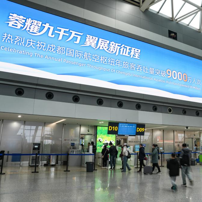 12月31日,成都双流国际机场航站楼内,成都国际航空枢纽年旅客吞吐量突破9000万人次的主题标识。(新华社记者王曦摄)